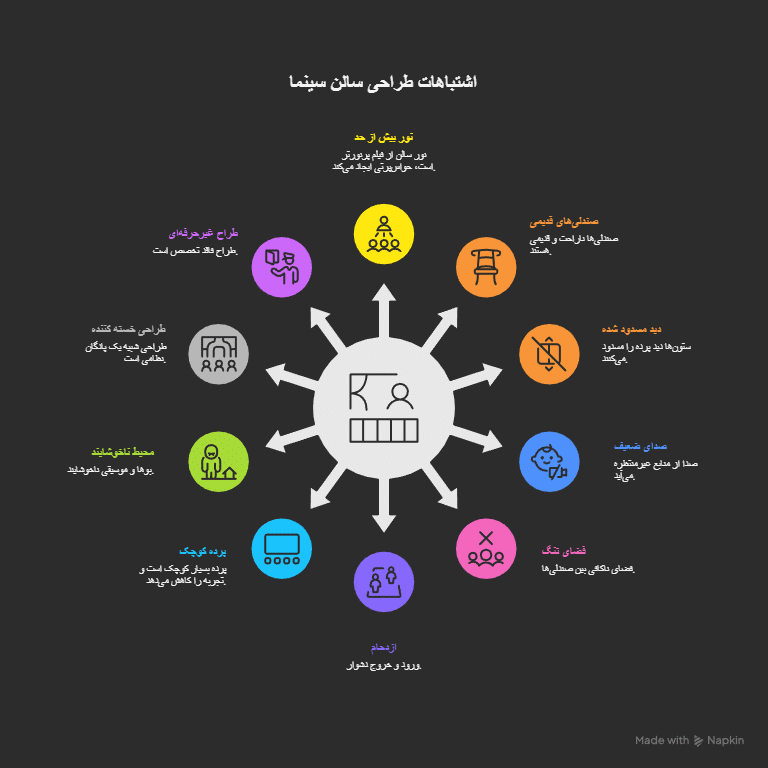 | مشکل اصلی سالن سینما | طراحی نامناسب سالن و اشتباهات فنی مانند نورپردازی، صندلیها، دید محدود، و آکوستیک |